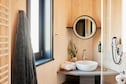 El cómodo dormitorio incluye una cama doble grande y un baño privado con ducha, lavabo e inodoro. Disfrute del aire fresco y las vistas a la naturaleza desde su terraza privada con asientos de jardín.