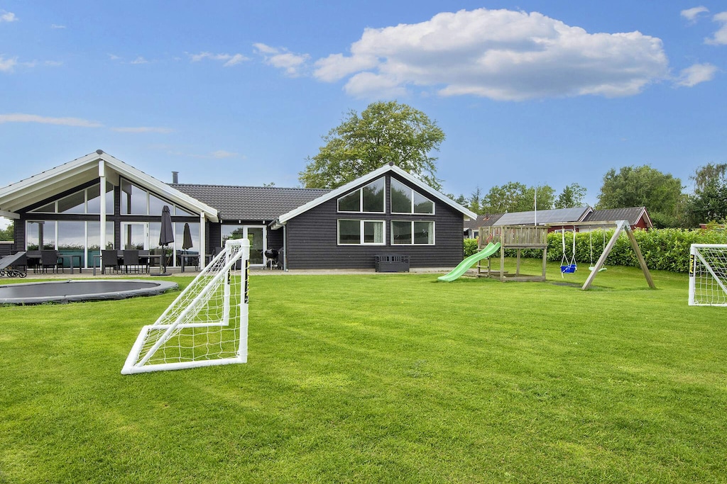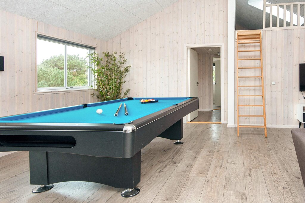 Casa de campo bien equipada con piscina, jacuzzi y sauna, así como diversas actividades ubicadas en Hvidbjerg Strand. La sección de la piscina de la casa contiene una gran piscina con entrenador de natación, una gran bañera de hidromasaje incorporada y una sauna con capacidad para 4 personas. La piscina es de 18 m & # 178; y con tobogán para los peques. Aquí, jóvenes y mayores seguramente pasarán muchas horas jugando y chapoteando. En la sala de actividades se puede jugar al ping pong, al billar y a los dardos electrónicos. Hay varios televisores en diferentes departamentos, así como PlayStation4 y Nintendo Wii para entretenimiento. El comedor / sala de estar está decorado con buen gusto con estéreo con reproductor de CD, TV, reproductor de blu-ray, silla alta, área de sofá y estufa de leña. En la cocina bien pensada, hay un gran frigorífico, congelador y dos lavavajillas y dos estufas, por lo que hay muchas oportunidades para cocinar. La casa es extremadamente espaciosa y bien dimensionada y está construida alrededor de dos áreas para dormir con un total de seis dormitorios. Cada sección tiene su propio baño y hay un baño adicional en conexión con la sección de la piscina. Además, hay un altillo con cuatro camas supletorias, que los niños tienen garantizado para utilizar como parque infantil. En la parcela hay un columpio, un cajón de arena y un trampolín (usado bajo su propio riesgo / seguro). En la terraza orientada al oeste se puede disfrutar del sol todo el día. Debido al tamaño de la casa, el precio de la limpieza en este Skanluxhus difiere del precio de lista normal. La liquidación de consumos, limpieza y fianza se paga en efectivo en el lugar al cuidador. No se alquila a grupos de jóvenes.