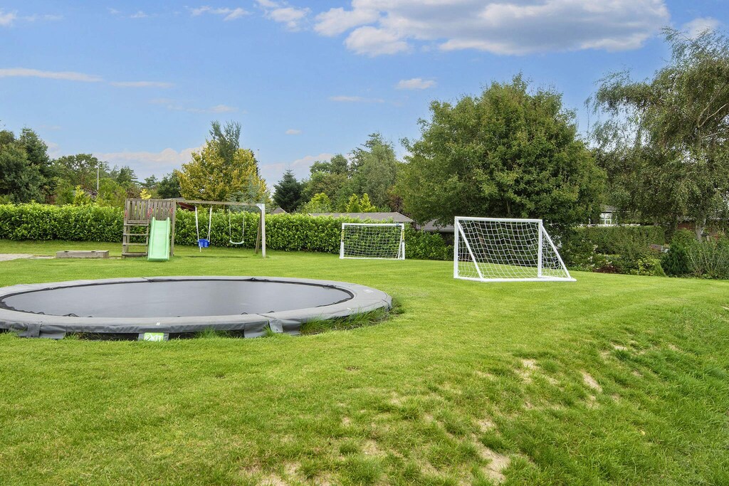 Stort og fint basseng med sklie og boblebad, Stort oppholdsrom med god plass til 16 personer til måltider, Artig TV-stue og lekerom med biljard, bordtennis og dart, Fint uteområde med trampoline, hustestativ, sandkasse og fotballmål, Rent, ryddig og velholdt,