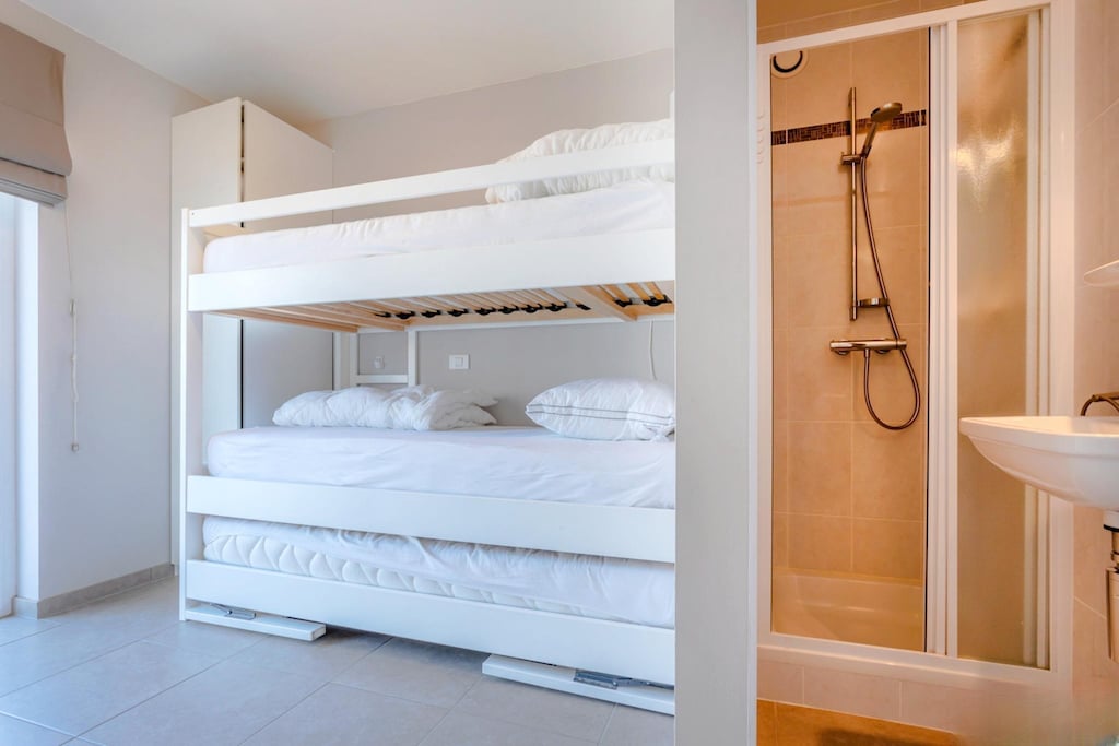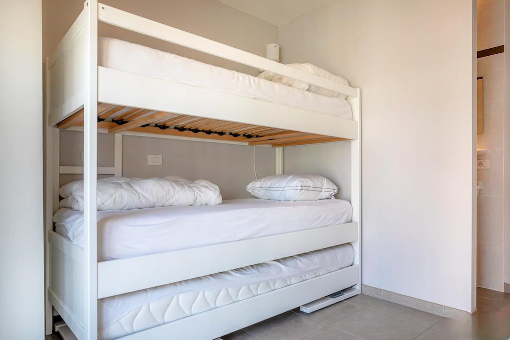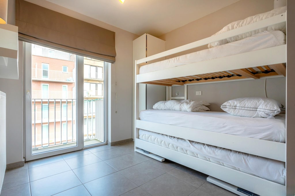 Si explora más a fondo, encontrará dos dormitorios bien equipados para satisfacer sus necesidades. Una habitación cuenta con una espaciosa cama doble (1,60 m) adornada con un acogedor edredón, mientras que la otra es ideal para niños o amigos, con tres literas (90 cm) para que disfrute de sus sueños. El apartamento también incluye un moderno baño con una lujosa bañera y lavabos dobles, además de un inodoro separado para mayor comodidad. Durante los meses más fríos, manténgase abrigado con la calefacción central de gas, que garantiza comodidad durante toda su estancia.