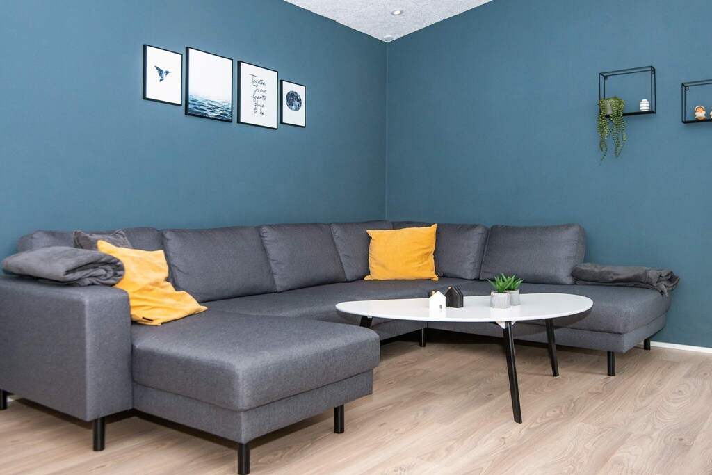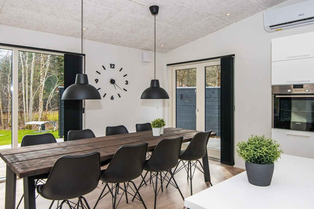 Casa de vacaciones con bañera de hidromasaje ubicada en una zona ideal para familias junto al lago Kvie. La cabaña está construida con los mejores materiales y con una gran cantidad de hermosos detalles. La cocina está en conexión abierta con la sala de estar, que está amueblada en un hermoso estilo escandinavo con i.a. televisión de pantalla plana. Desde el salón se accede a una terraza parcialmente cubierta, donde se puede disfrutar del sol y la naturaleza en el buen mobiliario de jardín. Hay una estación de carga junto a la casa para cargar coches eléctricos. No se alquila a grupos de jóvenes.