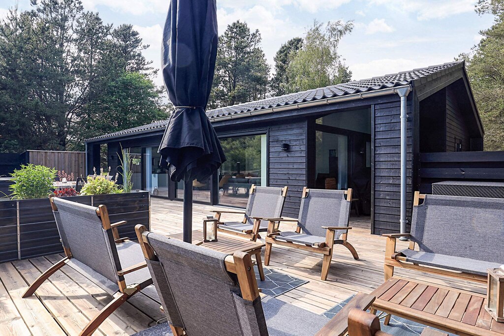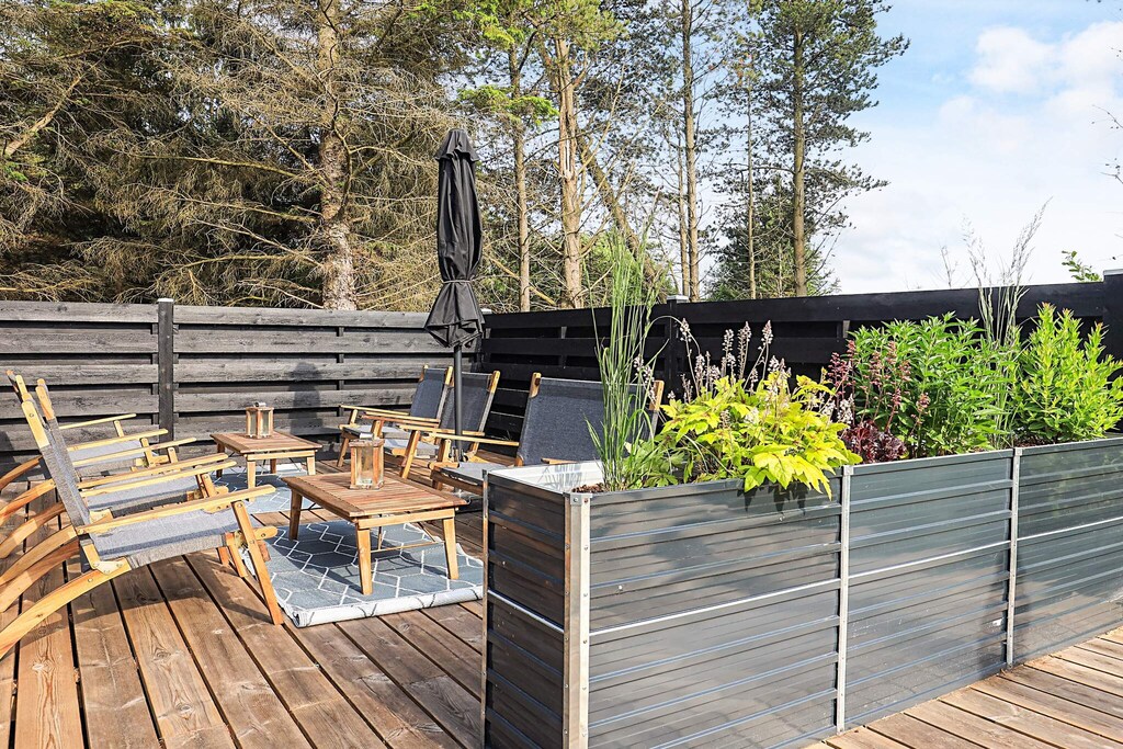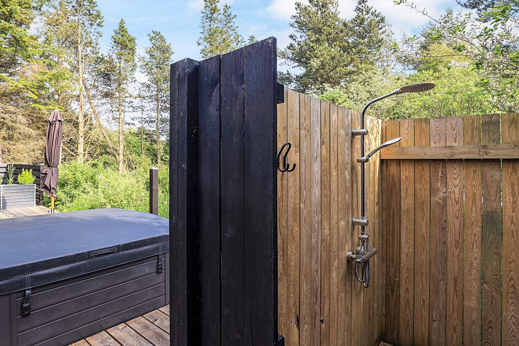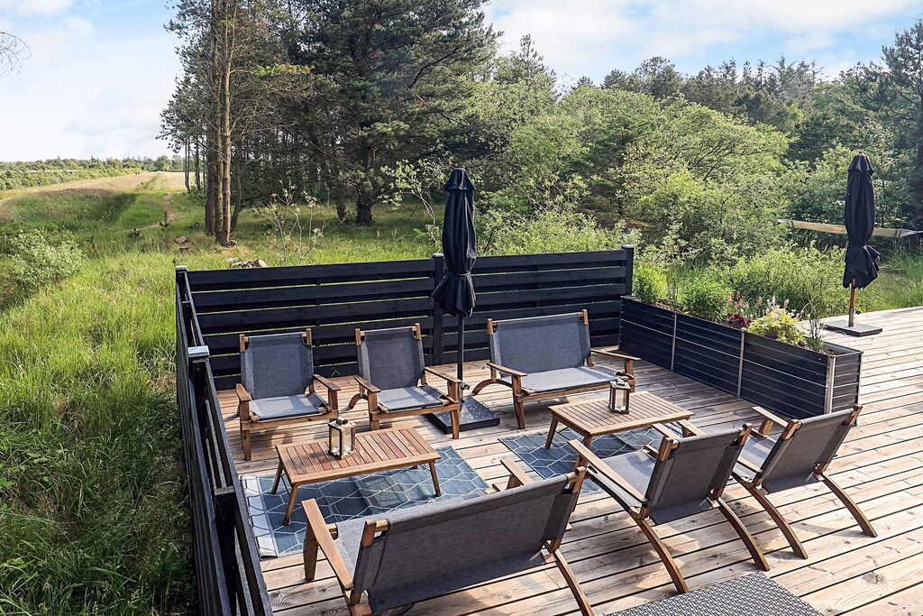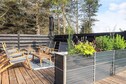 La terraza que rodea la casa es fantástica y permite disfrutar de las vacaciones al aire libre. Sus numerosos rincones son perfectos para todo, desde tomar el sol y relajarse hasta hacer una barbacoa en una cálida tarde de verano. Las terrazas que rodean la casa ofrecen amplio resguardo, sombra y la oportunidad de moverse al ritmo del sol. En verano, también se puede disfrutar de una agradable ducha al aire libre en el jardín con el canto de los pájaros.