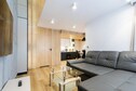Este lujoso y espacioso apartamento se encuentra en una planta baja elevada. Decorado con un estilo moderno y materiales de la más alta calidad, consta de una sala de estar (con TV, un cómodo sofá cama doble y una mesa de centro), una cocina bien equipada, dos dormitorios independientes (uno con cama doble y el otro con dos camas individuales) y un baño con ducha (con lavadora). El apartamento tiene terraza y balcón. Dispone de calefacción central. Hay internet inalámbrico disponible. Hay una plaza de aparcamiento vigilada junto al apartamento.