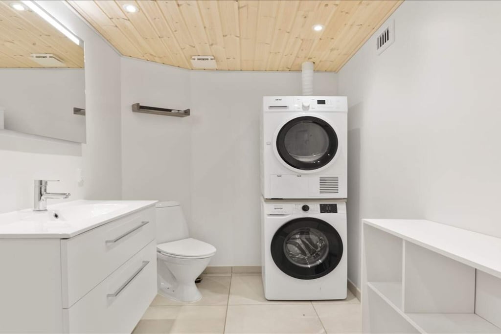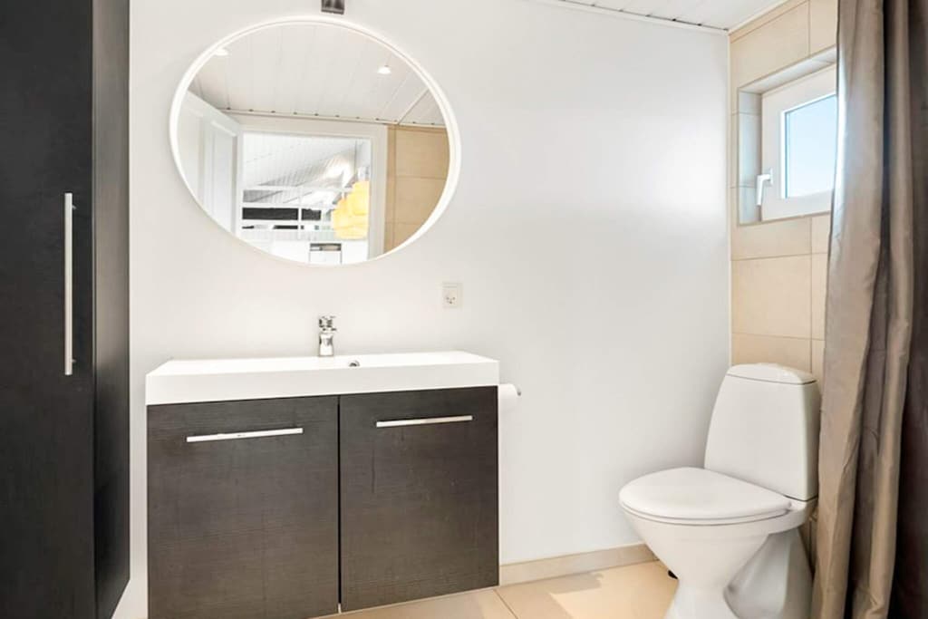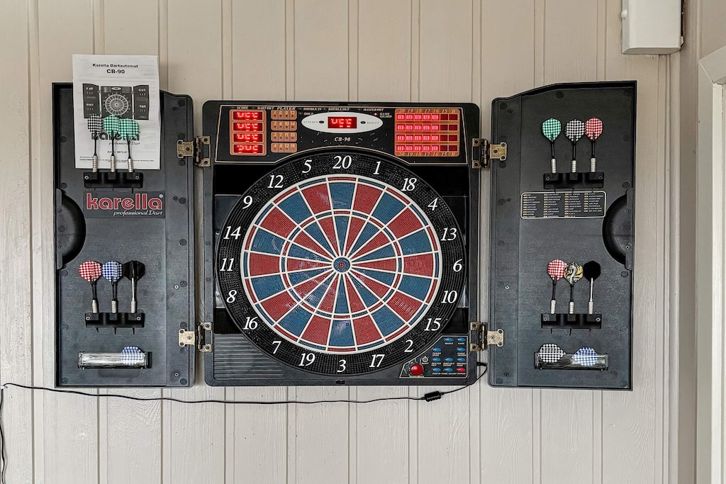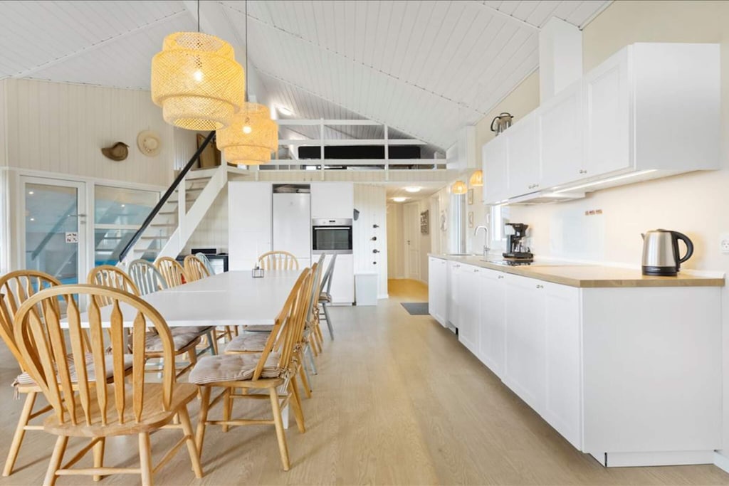 Ideal para familias o grupos, la casa cuenta con cinco dormitorios con camas de alta calidad (cuatro con dos camas individuales cada uno y uno con dos literas). Las opciones de entretenimiento incluyen billar, futbolín, hockey de aire, dardos electrónicos y una PlayStation 4 con juegos. En el exterior, varias terrazas con mobiliario de jardín y dos parrillas de carbón ofrecen el entorno perfecto para relajarse o cenar mientras disfruta de la vista del fiordo. Entre los servicios adicionales se incluyen lavadora, secadora, bomba de calor para eficiencia energética y una estación de carga para coches eléctricos. No disponible para grupos de jóvenes ni profesionales.