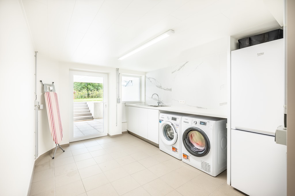 Planta baja: A nivel de calle y jardín se encuentra el garaje donde se pueden aparcar bicicletas, cochecitos y remolques para bicicletas. Puede aparcar un coche delante del garaje. Detrás del garaje hay un lavadero, un lavadero y un baño totalmente equipado con aseo independiente.