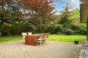 Der eingezäunte Garten mit überdachter Terasse und die Einrichtung