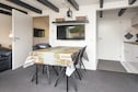 En la planta baja, encontrará una cocina bien equipada, abierta a la sala de televisión, que también cuenta con comedor, un baño con ducha y un dormitorio con cama doble y televisión. En la planta superior, hay un dormitorio con una cama doble y una cama individual.