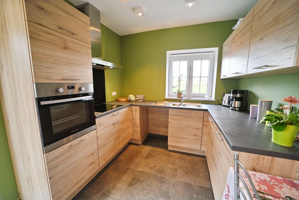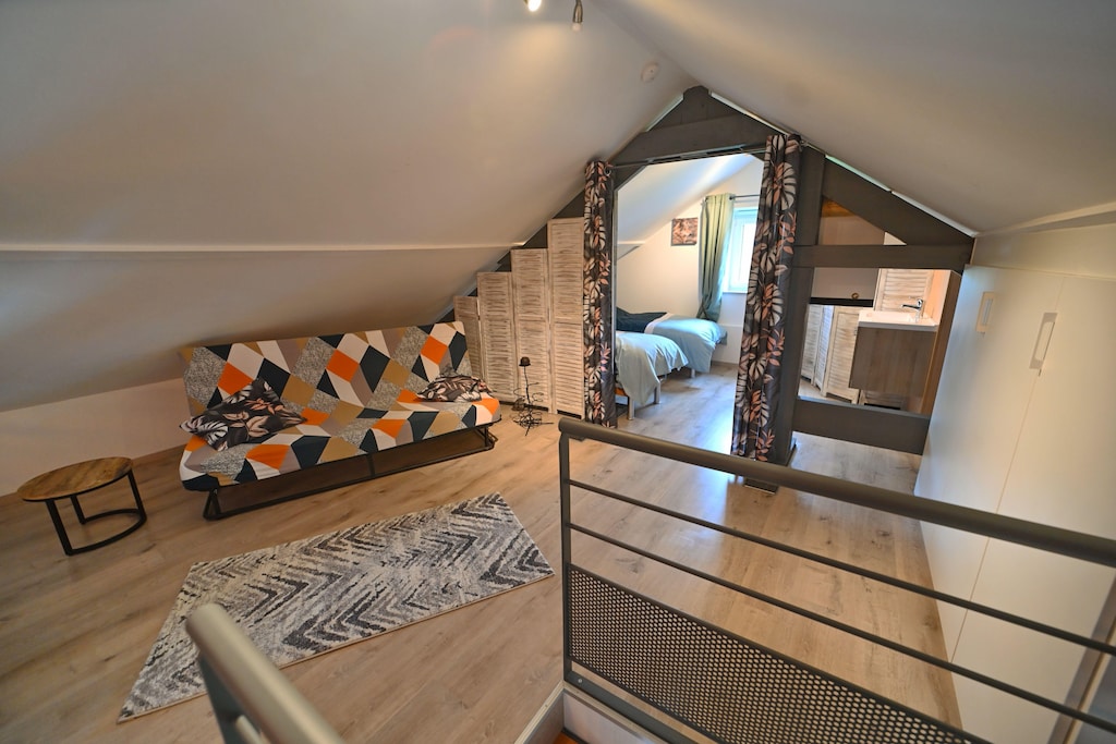Very recent holiday home, ideally equipped for a maximum of 4 people, 200m from the Ourthe near Melreux - Hotton. The cozy Durbuy (10 km) and Hotton (2.5 km) are easily accessible in the area. Cozy living room with open kitchen, bedroom with double bed and modern bathroom with shower. A large sliding window gives access to the sun-oriented terrace and small enclosed garden. On the first floor you have a spacious mezzanine and one open bedroom with two single beds and a sink.