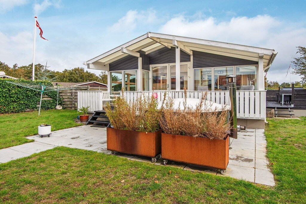 Esta casa de vacaciones se encuentra en una popular zona rural en la ciudad portuaria de Juelsminde y ofrece la comodidad adicional de un jacuzzi al aire libre. La casa cuenta con dos dormitorios y una cocina bien equipada conectada directamente con el acogedor salón, creando un ambiente cálido y acogedor. Desde el salón se accede a un espacioso jardín de invierno, el lugar perfecto para jugar a juegos de mesa, dardos o simplemente relajarse juntos por las tardes.