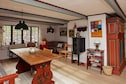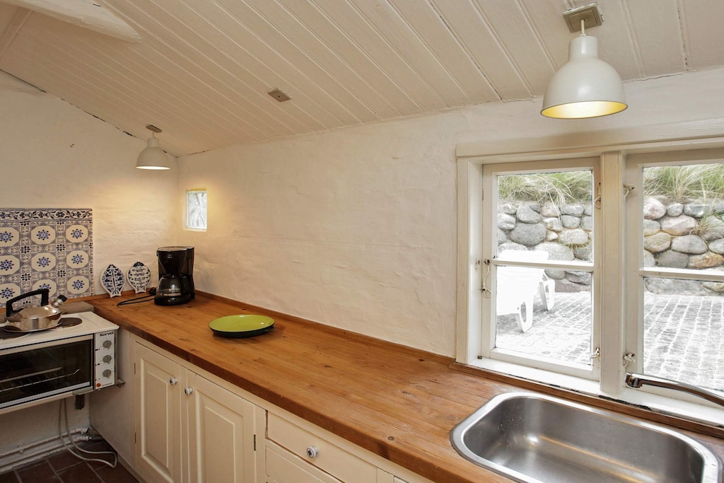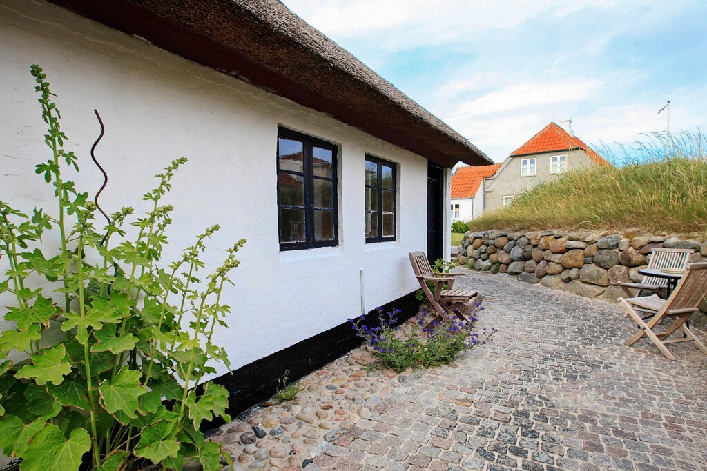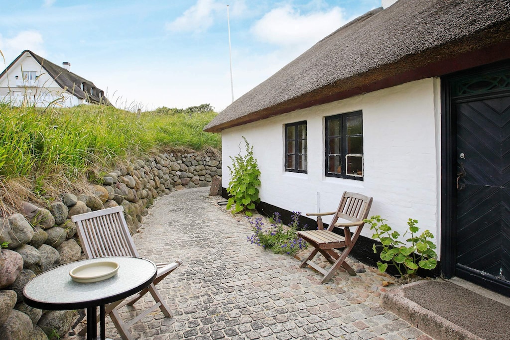 Esta casa de 1840 es probablemente una de las casas conservadas más antiguas de Løkken. Se caracteriza principalmente por su idilio con techo de paja. El nombre de la casa es & # 8221; Vejhuset & # 8221 ;. El nombre se remonta a la antigüedad, cuando el norte de los dos caminos a la playa en Løkken pasaba directamente por Vejhuset. La casa ha sido renovada continuamente, tiene una altura de techo de aprox. 2 m. Y está construido directamente sobre suelo compactado de tierra. Está decorada personalmente con muebles antiguos y tiene su propio patio, que se resguarda detrás de la duna. Las instalaciones de aseo y ducha de la casa se dividen en dos habitaciones. Con su ubicación central en la primera fila de dunas, está a solo unos minutos a pie del mar, la torre de agua y el centro de la ciudad de Løkken desde la casa.