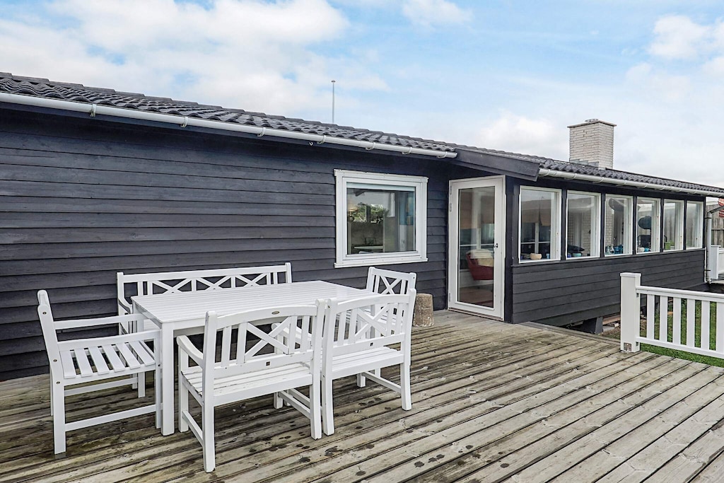 Fin beliggenhed mellem strand og by / Ikke meget sol på grunden (eftermiddag og aften) og udestue mangler stole ved spisebord (mest brugt til opbevaring af havemøbler)
