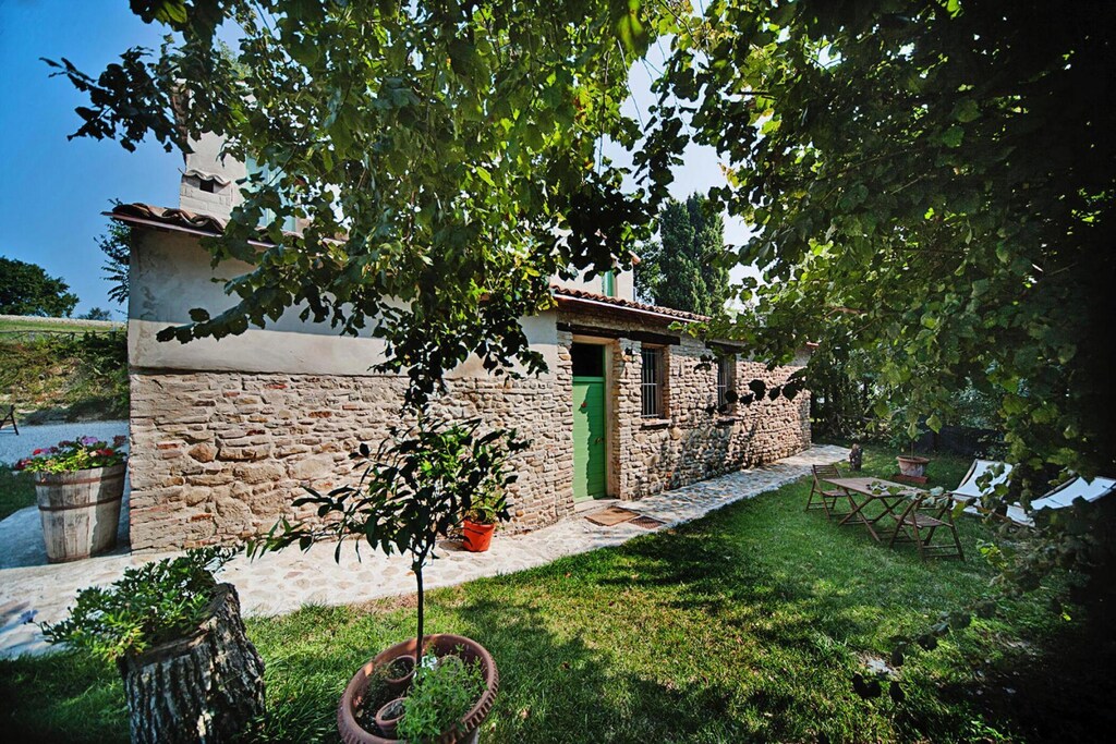 En la naturaleza floreciente del Parque Natural de San Bartolo, sobre las ondulantes colinas con olivares y sobre el mar azul de la costa adriática, se encuentra la granja del siglo XVII restaurada con cariño. El estilo arquitectónico de los apartamentos individuales corresponde al de un edificio residencial exclusivo y al mismo tiempo histórico. La tranquila ubicación natural invita a relajarse y a relajarse. Los apartamentos de la planta baja o del piso superior están amueblados de forma rústica y cómoda y tienen vistas al jardín. Algunos también tienen chimenea. Hay mosquiteras en todas las ventanas. La pequeña ciudad de Vallugola se encuentra entre Rímini y Pesaro en la bahía natural de Baia di Vallugola. Los atractivos son el puerto deportivo y la hermosa playa de guijarros en el cristalino mar Adriático. A sólo seis kilómetros se encuentra la localidad costera familiar de Gabicce Mare, con su característico casco antiguo, en cuyas calles estrechas y empinadas hay tiendas y talleres.Ofertas del complejo vacacional: