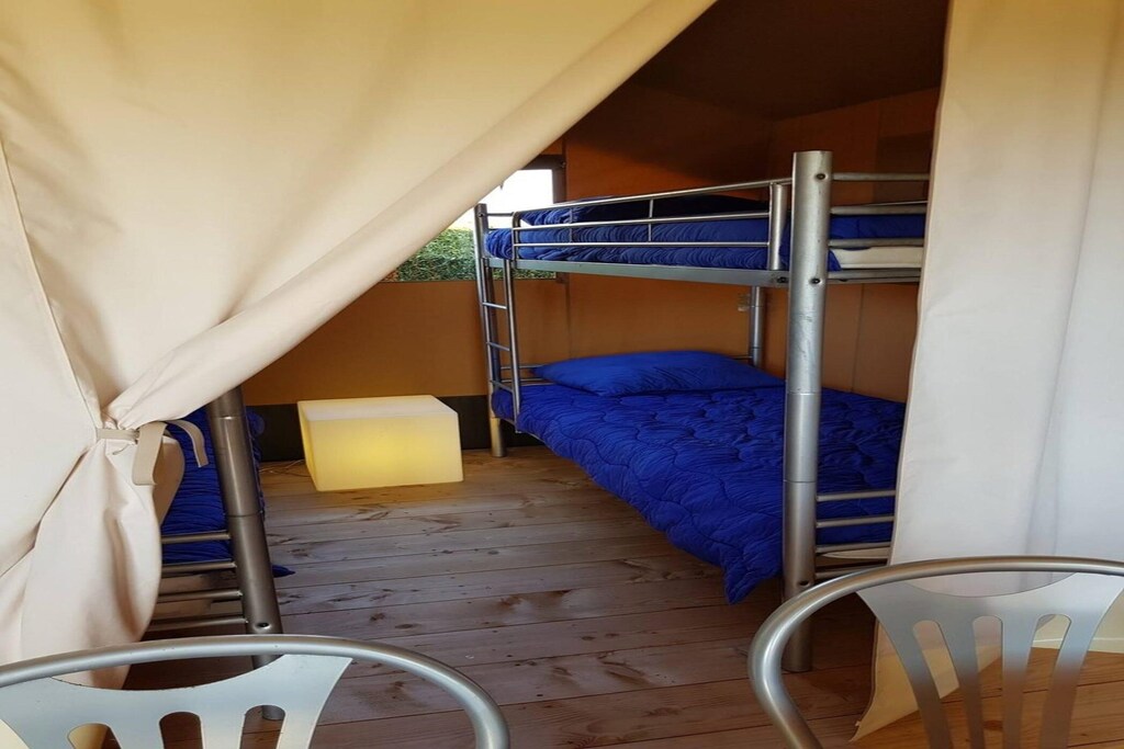 Las tiendas ofrecen dos dormitorios: uno con una cama doble y otro con dos juegos de literas, lo que proporciona una disposición flexible para dormir para familias o grupos. Para mayor comodidad, los huéspedes tienen acceso a un edificio de baños cercano, situado justo al lado de las tiendas de safari.