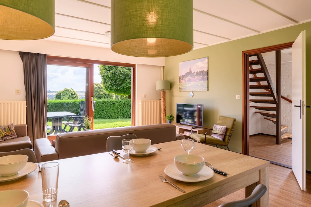 El salón tiene una zona de estar con televisión y está junto a la cocina abierta con comedor. La cocina está equipada con una nevera con congelador, una máquina Senseo, un microondas combinado y un lavavajillas.