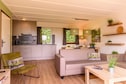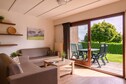 En el exterior hay una terraza amueblada con sillas ajustables con cojines y una sombrilla. El bungalow tiene un trastero interior, que no es adecuado para bicicletas.